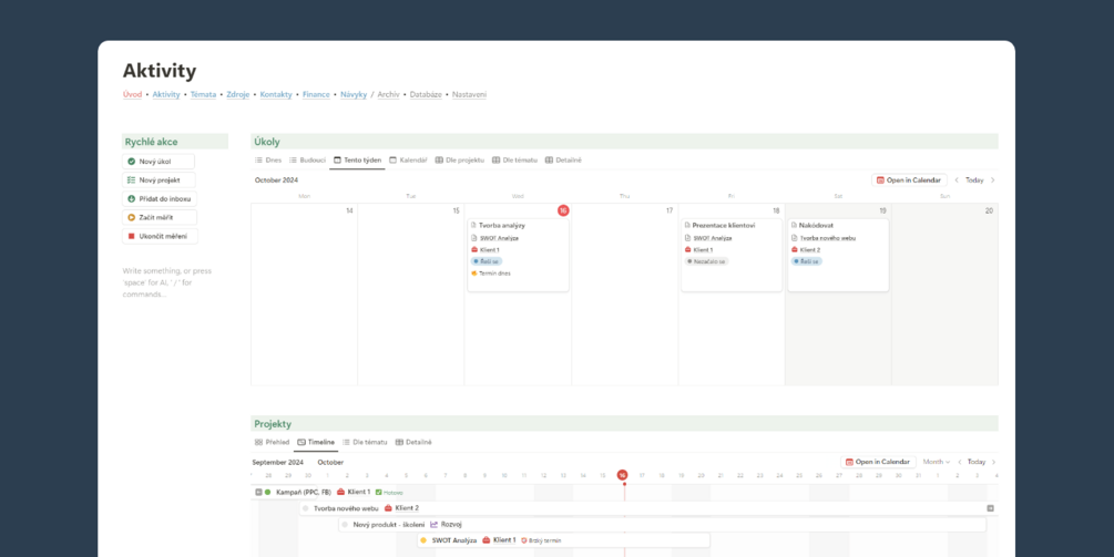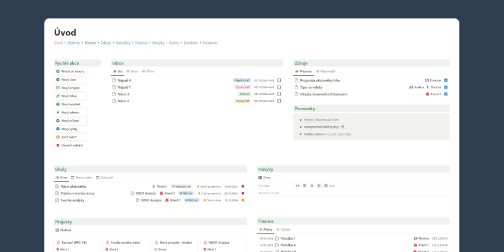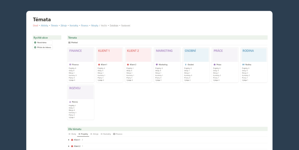 - témata jako hlavní rozcestníky, kde se sdružují úkoly, projekty, zdroje, kontakty a finance