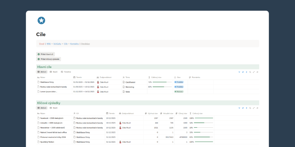 - cíle (OKR - hlavní cíle a klíčové výsledky)